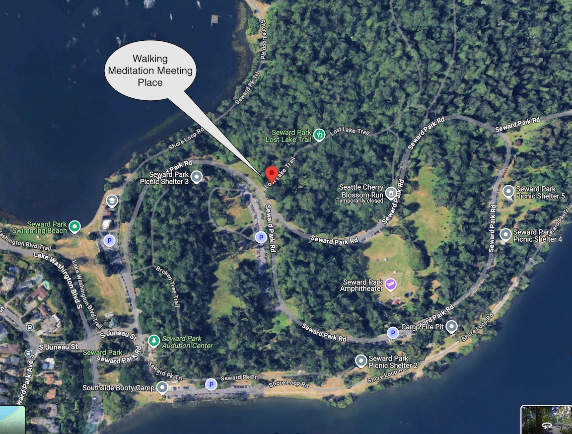 Mindful Walks in Seward Park on 2nd and 4th Saturday of Each Month Join us on the 2nd and 4th Saturday of each month from 8:30 to 9:30 AM for a slow mindful walk through the spectacular old growth forest of Seward Park. We meet at the “Fairy Tree” trailhead near the 1st upper parking lot of the park. We start with a song or chant and then start a slow quiet walking meditation over a half mile loop. About 3/4th of the way along the loop, we stop and share what we noticed as we walked on our loving Earth. We talk and share thoughts on the way back to our starting point. We end the time together with another song. For more information, contact David Lee at dav@dav00.com